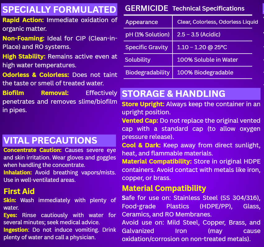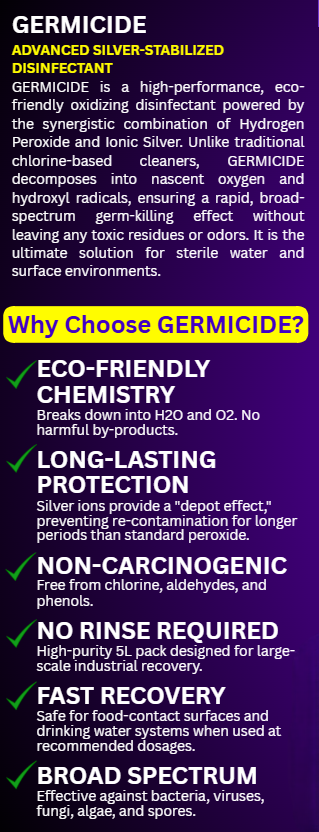 Elevate your hygiene standards with BlueWello GERMICIDE, a high-performance, eco-friendly oxidizing disinfectant. Powered by the synergistic combination of Hydrogen Peroxide and Ionic Silver, it provides a rapid, broad-spectrum germ-killing effect without leaving toxic residues.