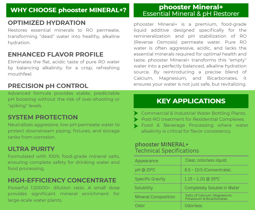 Transform your RO water into healthy, alkaline, and mineral-rich drinking water with phooster MINERAL. Designed specifically for commercial and industrial water treatment, this premium liquid additive restores the essential minerals lost during the Reverse Osmosis process, ensuring your water isn’t just pure, but revitalized.